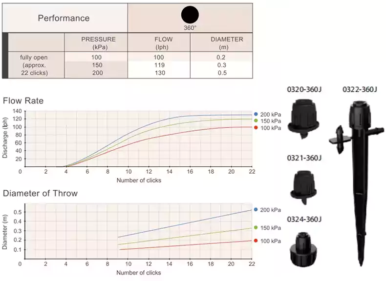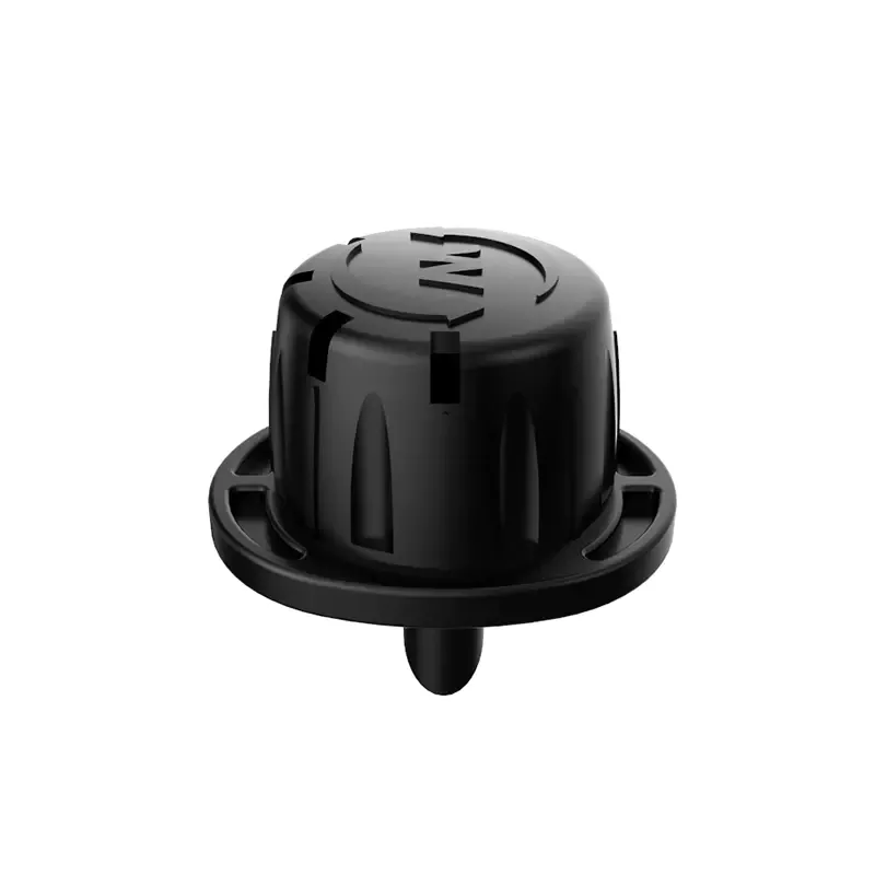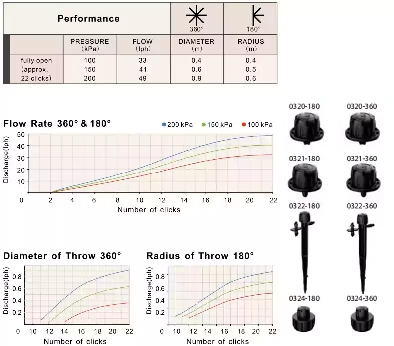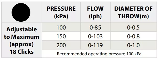 A rotação da tampa Mini Bubbla permite o ajuste simultâneo da vazão e do diâmetro de lançamento. Este pulverizador Twista de fluxo ajustável tem um padrão de guarda-chuva uniforme que aplica suavemente água na zona da raiz da planta.
