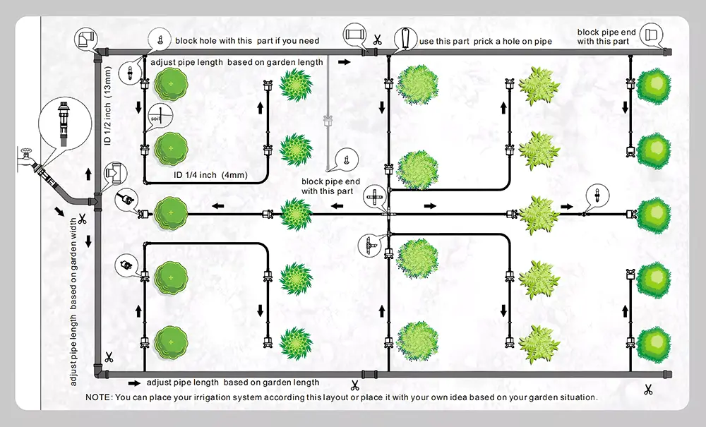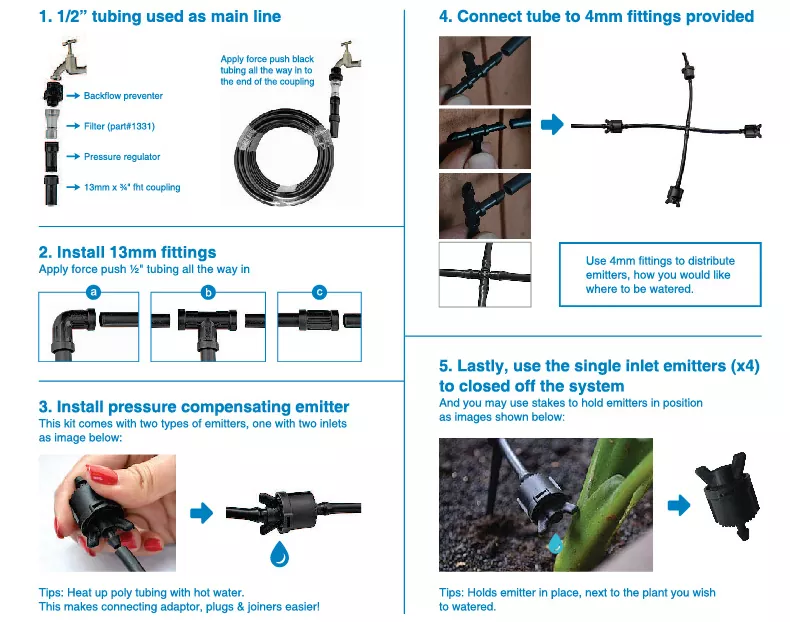 Fácil instalação:Projetado para configuração DIY com tubos flexíveis, emissores e conectores.