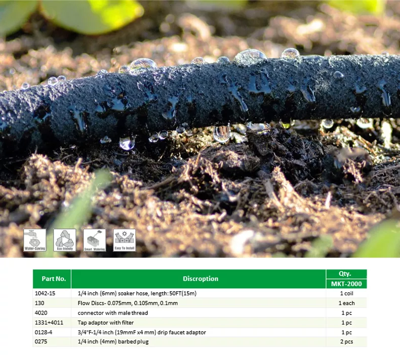 KIT DE INICIALIZAÇÃO DE MANGUEIRA DE SOAKER DIY MKT-2000 1, crie facilmente uma rega eficiente e conveniente sistema para o seu jardim 2, a mangueira Soaker conserva até 70% mais água, economizando você dinheiro e ajudando a sustentar nossos recursos naturais 3, contém tudo o que você precisa para configurar uma irrigação com mangueira de imersão sistema
