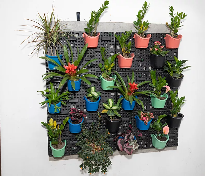 Este vaso para plantador com irrigação automática interna é colocado com suporte de jardim de parede vertical Watex e parede verde móvel de metal Watex.