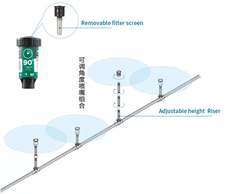 Nossos produtos abrangem dois tipos de sprinklers: rotativos e fixos. Tanto os aspersores rotativos quanto os fixos oferecem opções de ângulos como 90°, 180° e 360°, combinados com aspersores internos de ângulo personalizáveis, eles podem atender às necessidades de diferentes cenários de irrigação, desde áreas fixas até ajustes flexíveis, desde pequenas áreas de canto até grandes áreas inteiras, sem a necessidade de aquisição de equipamentos adicionais.