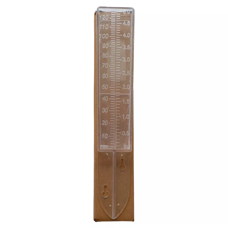 O pluviômetro pode ser inserido no solo na extremidade inferior, necessitando de observação em tempo real e registro dos dados pluviométricos, com marcação de escala máxima de 120mm.