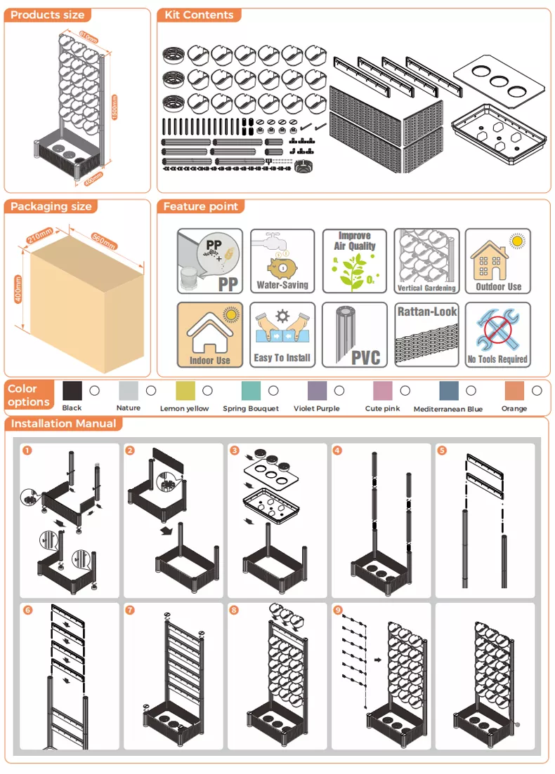 Se você deseja cultivar alguns vegetais comuns, como alface e tomate cereja, ou ervas como alecrim e hortelã, ou suculentas de vários formatos e flores coloridas, o Jardim Vertical Pátio Autônomo pode acomodá-los perfeitamente. Você pode combinar e combinar livremente de acordo com suas preferências, criar seu próprio jardim vertical exclusivo à mão e experimentar a diversão única da jardinagem DIY.