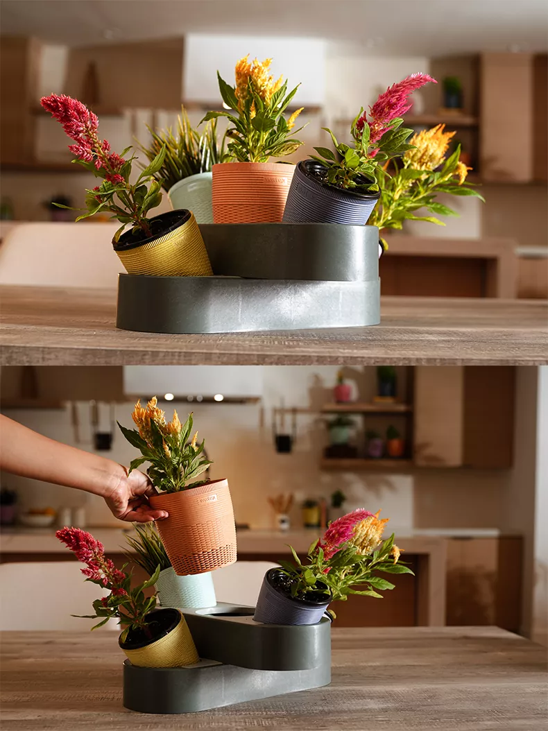 Empilhe as duas bases de armazenamento de água em cruz e, em seguida, coloque os vasos de flores dentro delas. Feito de materiais plásticos de palha de trigo ecológicos de alta qualidade, o kit de jardim de mesa empilhável Watex não é apenas elegante, mas também durável e duradouro. O Stackable Desktop Garden é incrivelmente fácil de configurar e um ótimo complemento para qualquer casa.